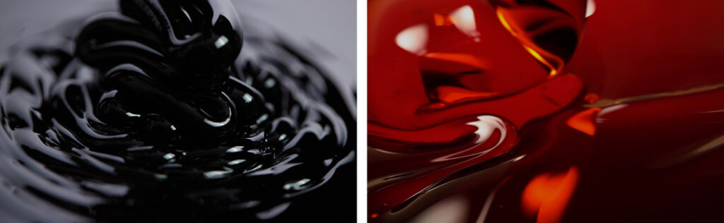 Molasses (left) is dark coloured, almost black in appearance, highly viscous with a rich bittersweet aroma. Black treacle (right), is lighter coloured, less viscous and with a sweeter aroma.