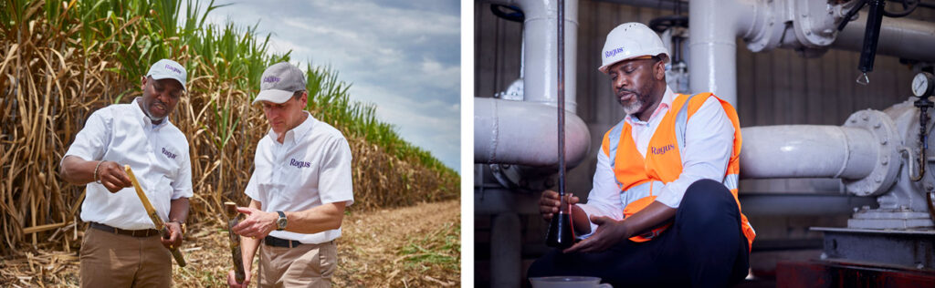 Cane molasses can only be made from sugarcane, which only grows in the tropics and is shipped to the UK in bulk. Left: Quality manager Ibrahim Belo and Director Ben Eastick visit a sugarcane grower in Colombia. Right: Ibrahim tests our molasses at every stage of the supply chain.